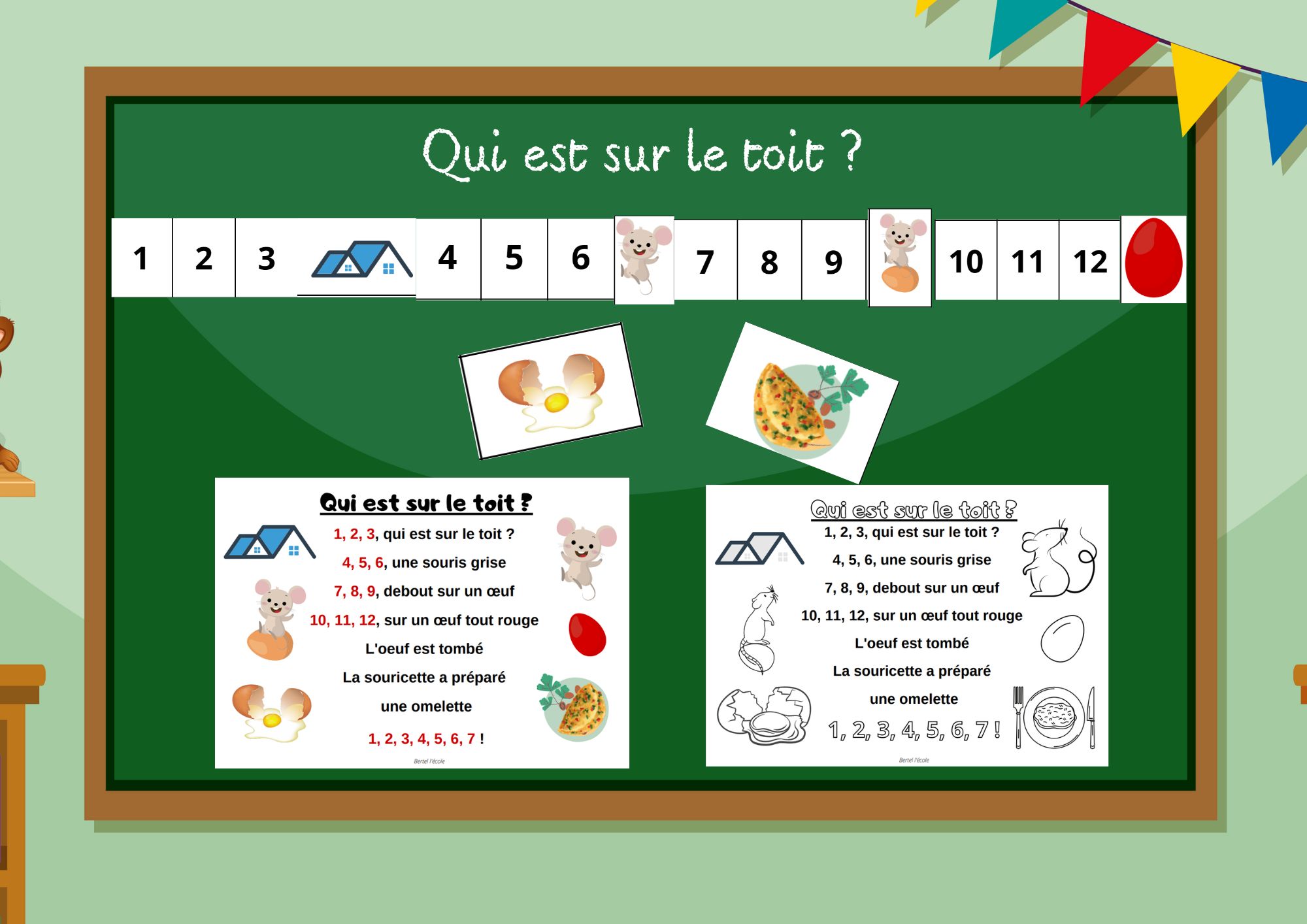 Je vous propose aussi des étiquettes à imprimer et plastifier afin de reproduire la comptine au tableau de manière linéaire comme sur l’image suivante