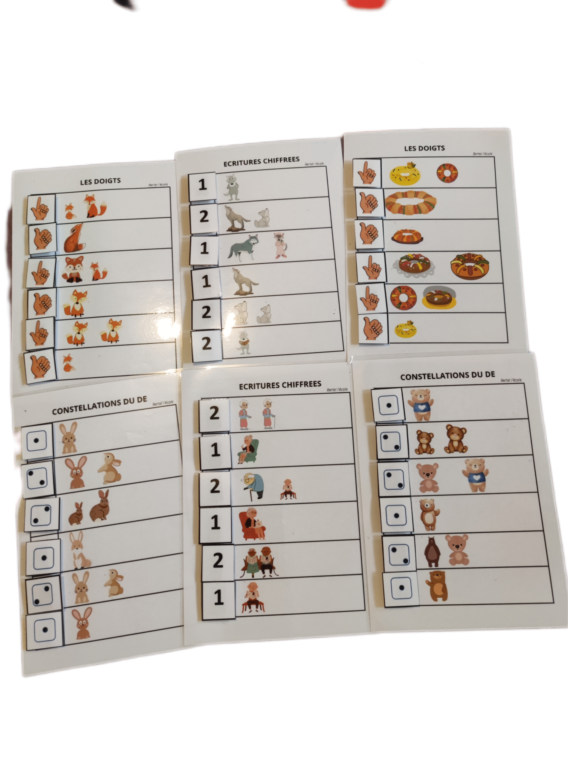 Sur chaque fiche, il y a les différentes représentations (doigts, constellation du dé, écriture chiffrée). Pour chaque quantité (de 1 à 5 par exemple), il y a 5 fiches.