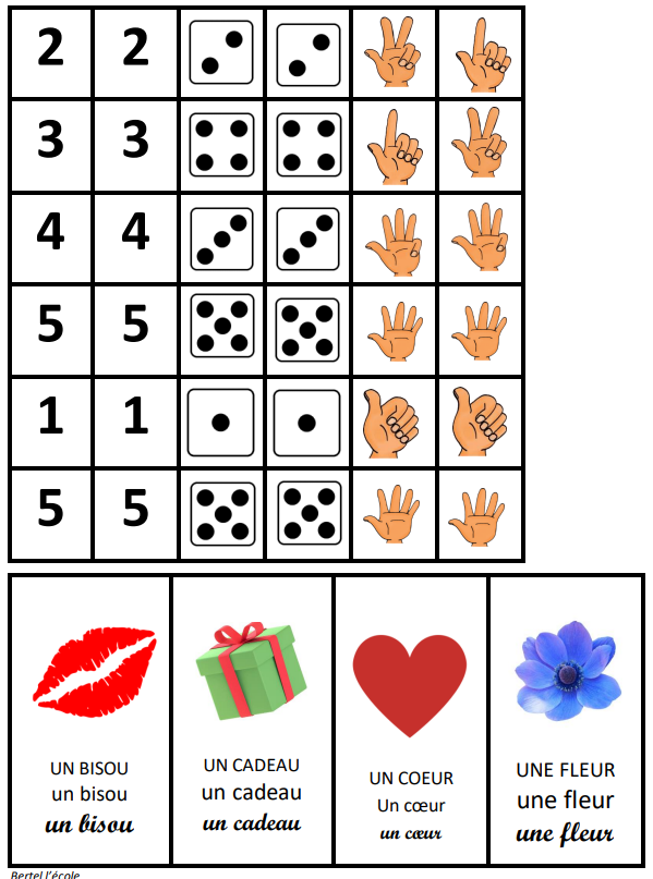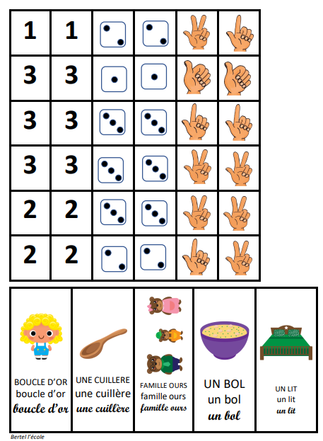 6 fiches à manipuler par les élèves (à imprimer et plastifier). Ils doivent associer à une collection (lit, petite fille, ours, cuillère, bol) la bonne représentation (doigts, écriture chiffrée ou constellation du dé)