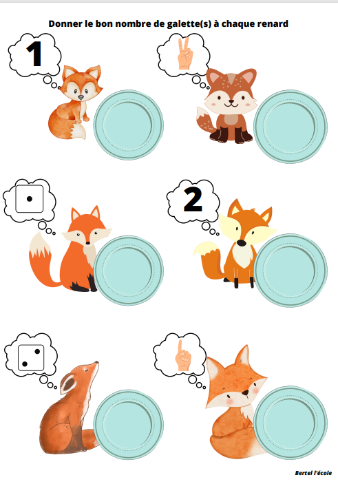 6 fiches à manipuler par les élèves (à imprimer et plastifier). Ils doivent associer à une collection (lapin, personne âgée,renard, loup, ours, galette) la bonne représentation (doigts, écriture chiffrée ou constellation du dé)