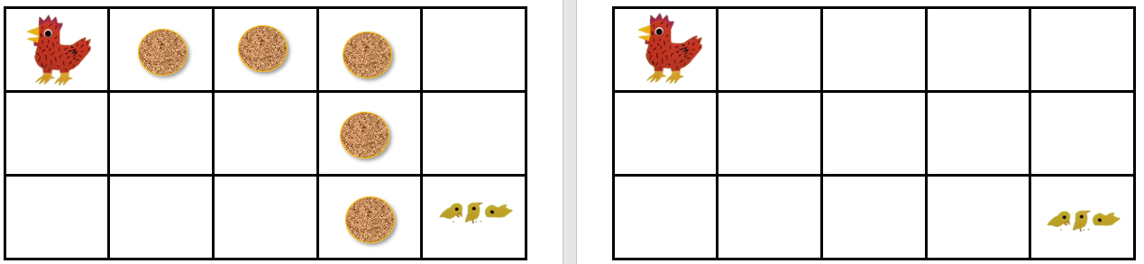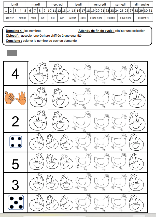 Les élèves doivent aider la petite poule rousse à retrouver ses poussins ! Ils doivent faire des boules avec de la pâte à modeler et les placer comme sur l’exemple