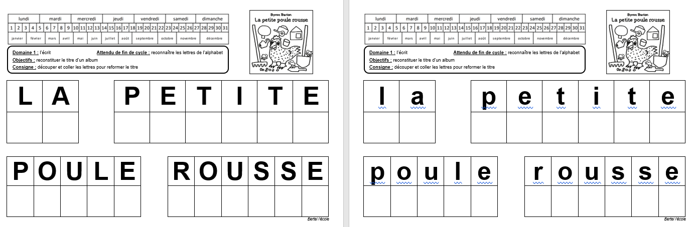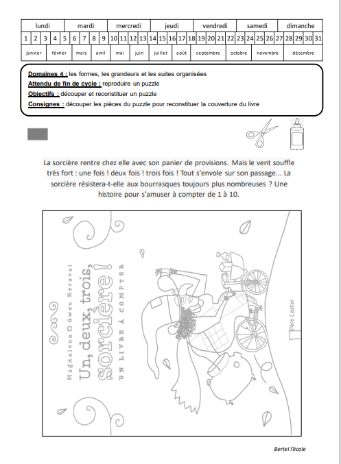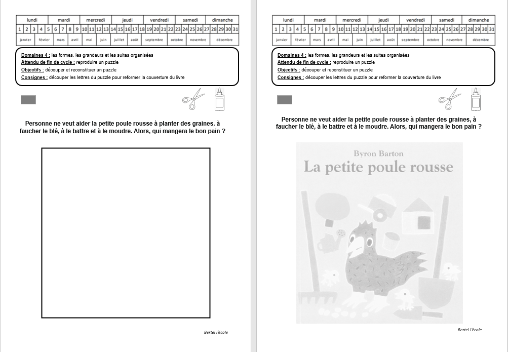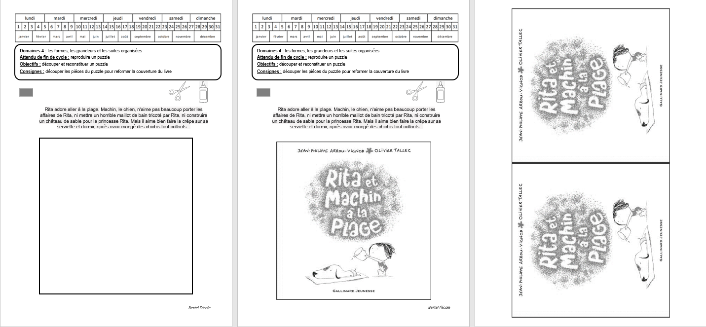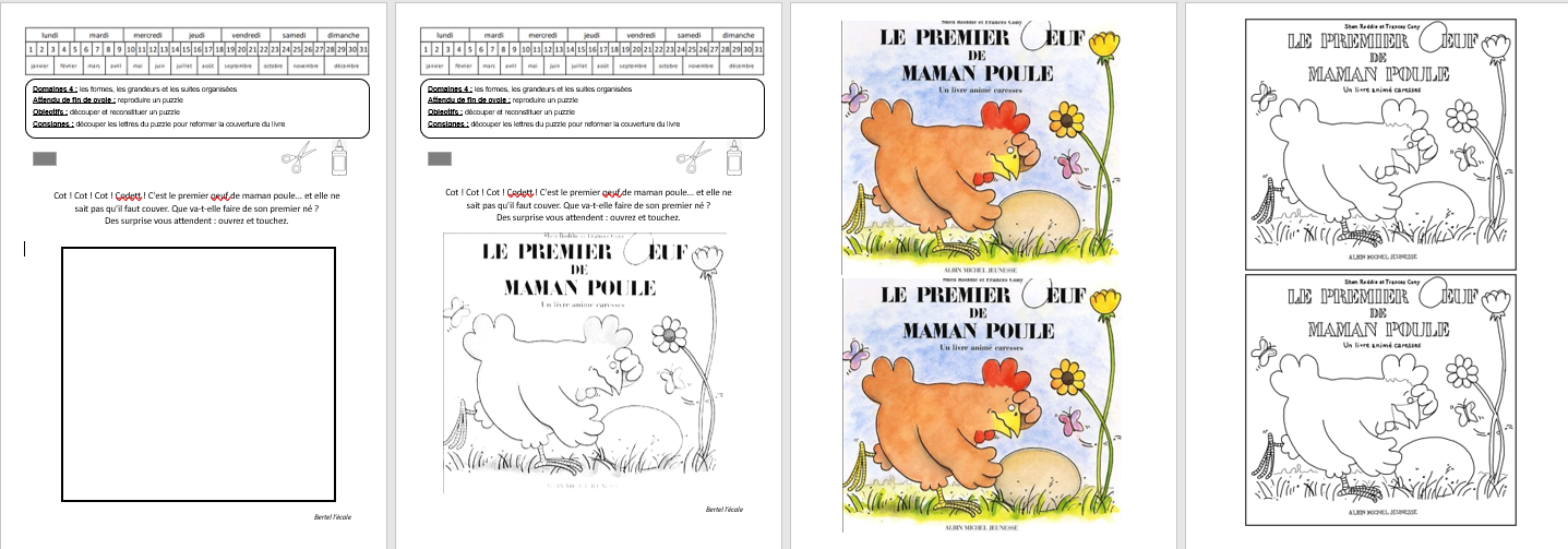 Je vous laisser choisir la forme et le nombre de pièces que vous souhaitez pour le puzzle. Il y a une fiche sans le modèle et une fiche avec le modèle. Je vous mets aussi la couverture à colorier au format A4 si besoin.
