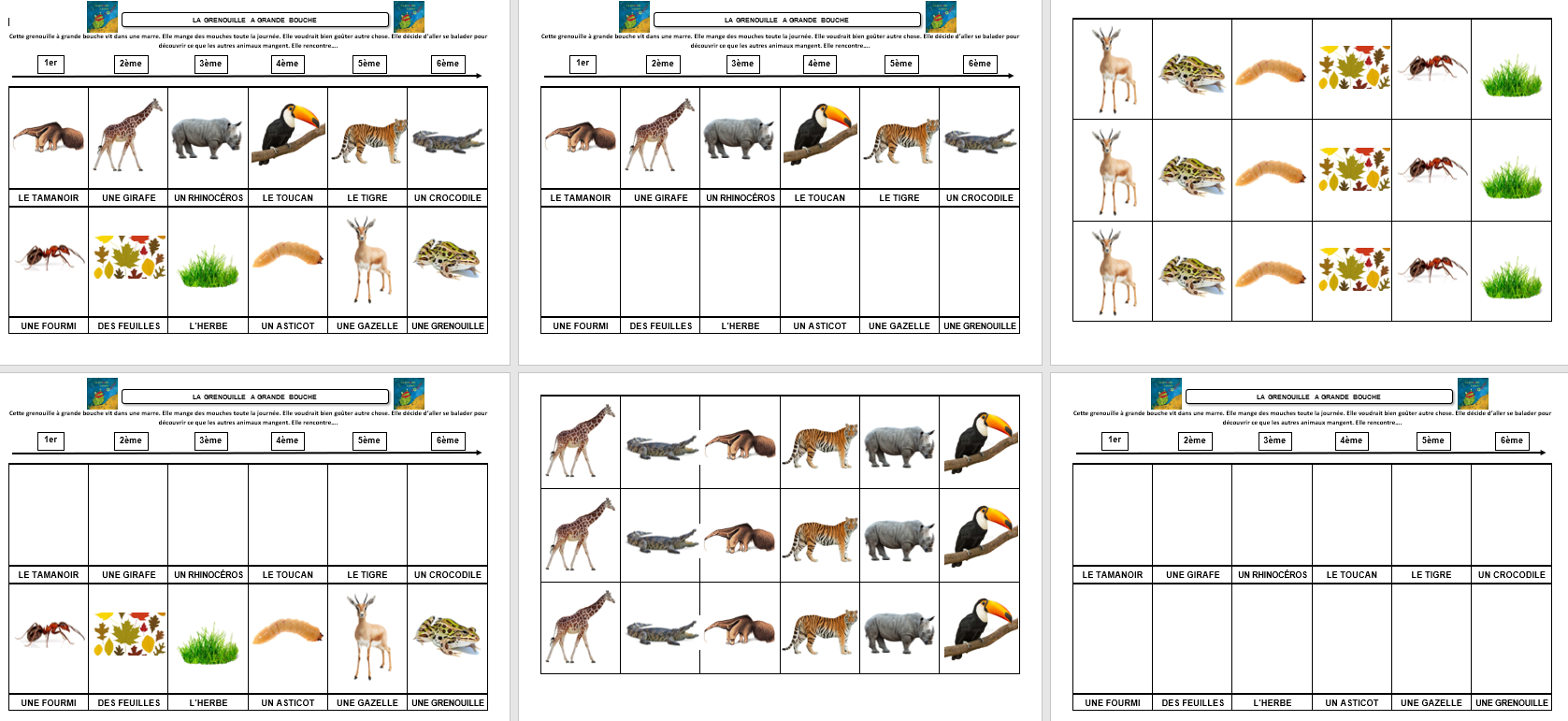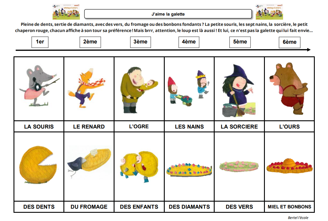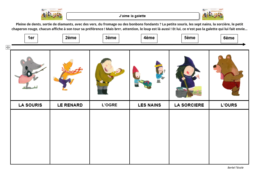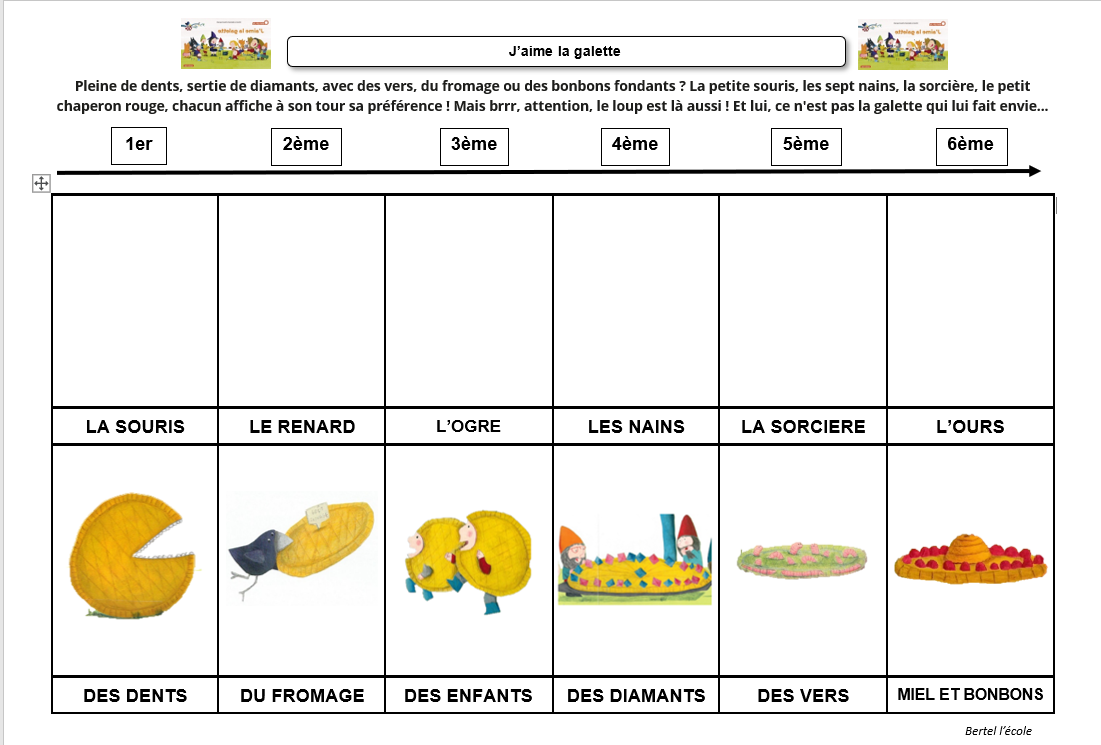 – Un document vierge où les élèves doivent remettre dans l’ordre les personnages et ce qu’ils mangent.