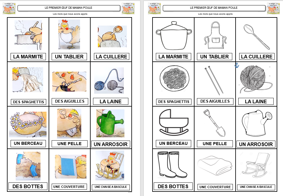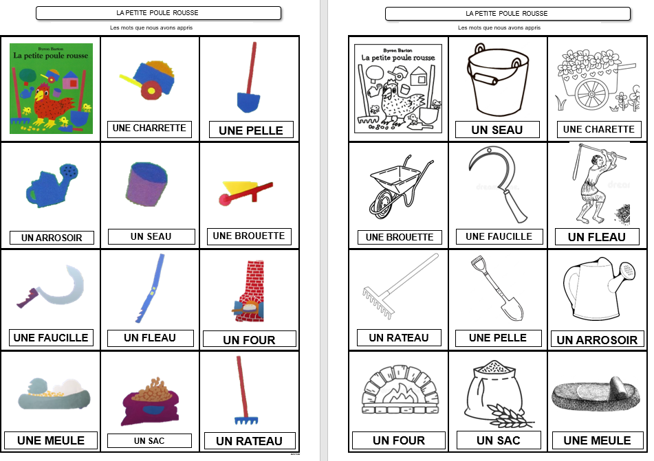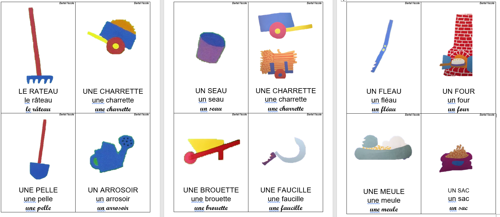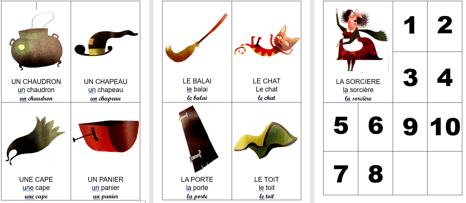 Voici les cartes des différents éléments de l’histoire ainsi que les cartes nombres pour les afficher au tableau