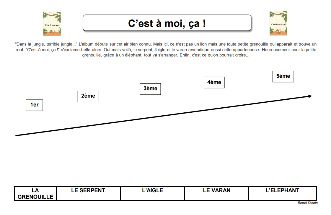 Ici vous retrouverez le document à afficher en classe qui reprend les personnages rencontrés selon l’ordre de l’album mais aussi ce qu’ils mangent. Vous avez ensuite les exercices pour les élèves. Plusieurs possibilités :